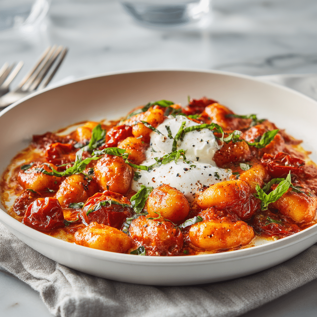 30 Minute Creamy Tomato Gnocchi with Burrata works because it layers flavors simply and efficiently. Slow-cooked tomatoes create natural sweetness, cream adds richness, and gnocchi absorbs the sauce beautifully. Burrata melts slightly over the warm pasta, creating a luxurious finish without extra effort.