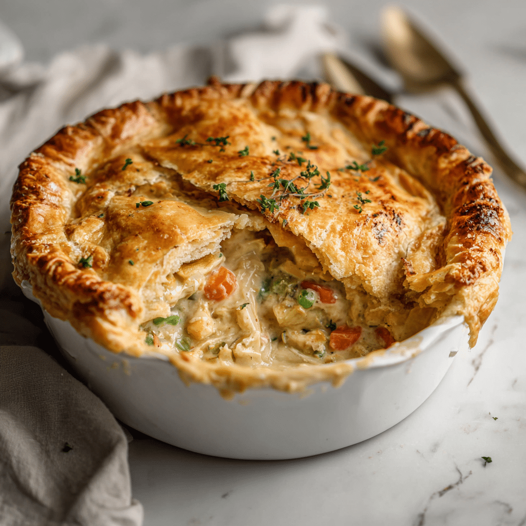Serve this homemade chicken pot pie with a crisp green salad or steamed vegetables for a balanced meal. Leftovers reheat beautifully and taste even better the next day.