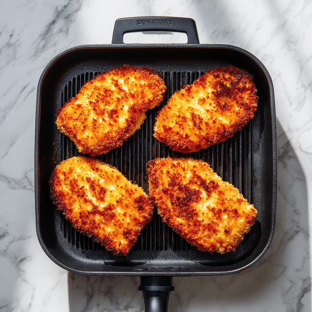 Place breaded cutlets on the hot griddle. Cook for about 3–4 minutes per side (6–8 minutes total) until golden brown and fully cooked.