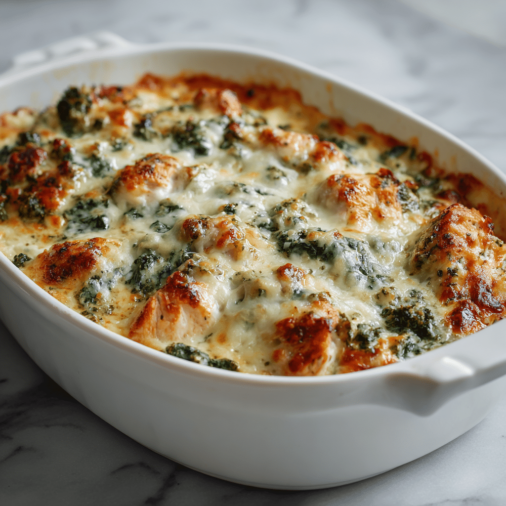 This dish combines classic comfort flavors with simple preparation. The creamy cheese topping keeps the chicken moist, while spinach adds color and balance.