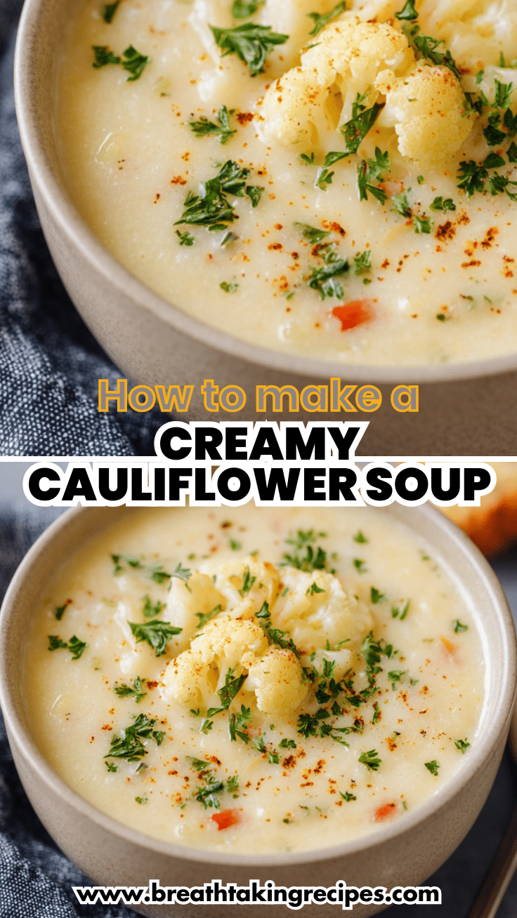 This cauliflower soup is perfect as a main dish or paired with a simple salad. Serve with crusty or buttered bread for dipping. Store leftovers in an airtight container in the refrigerator for up to four days. Reheat gently on the stovetop, stirring often. The soup can be made a day ahead and tastes even better after the flavors meld.