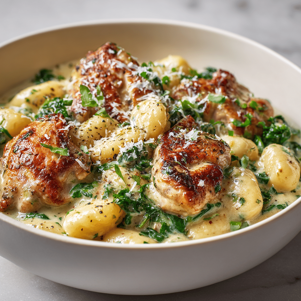 Creamy chicken and gnocchi made with tender chicken thighs, kale, and a rich Parmesan sauce.