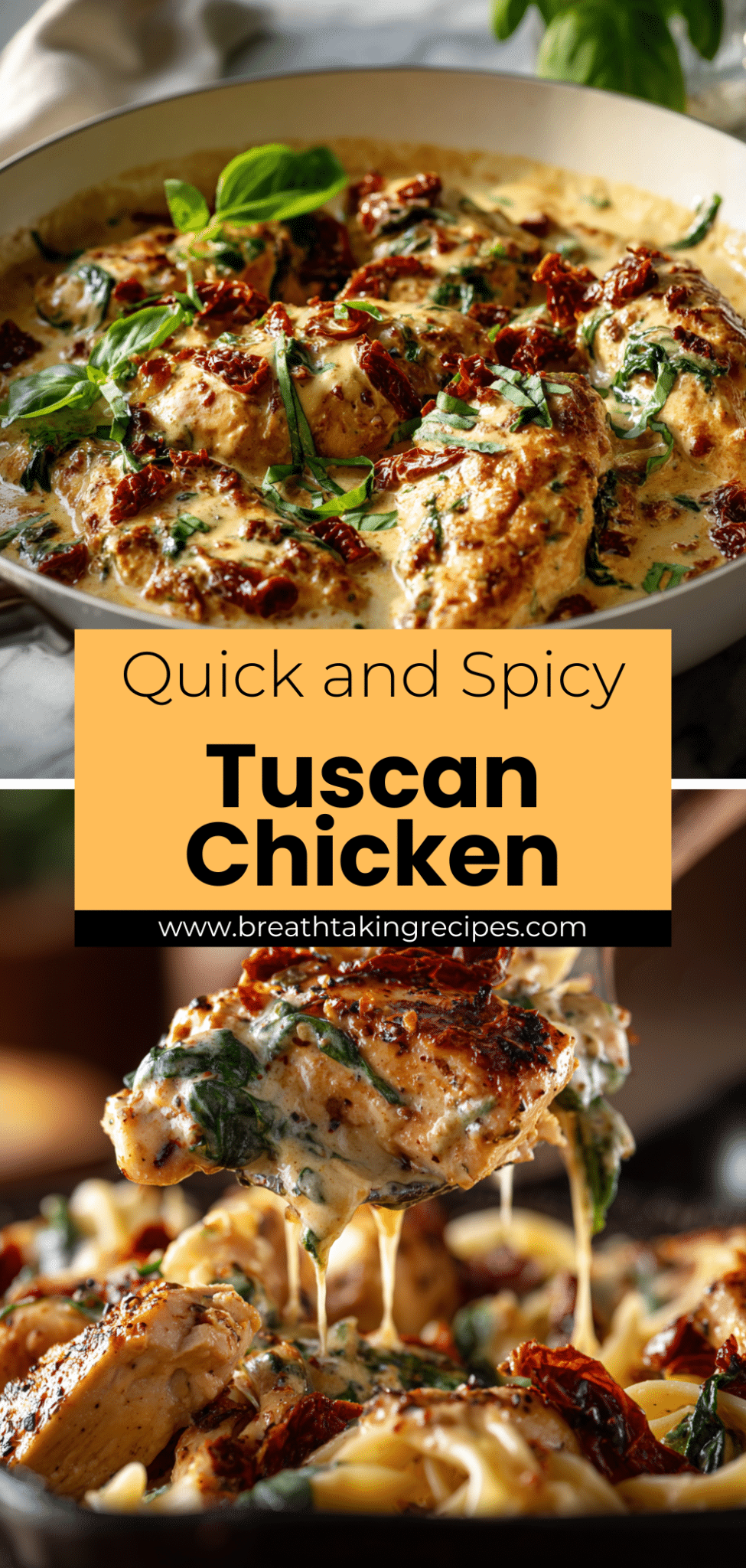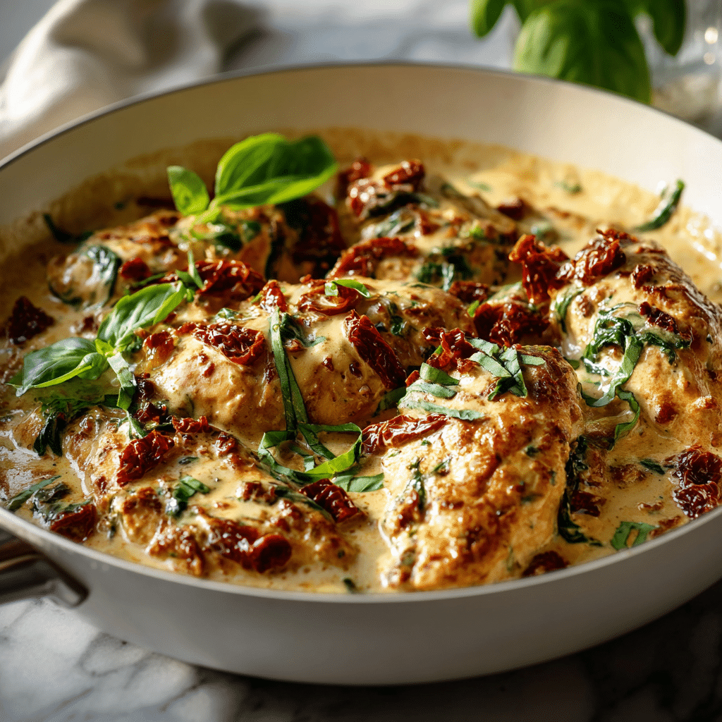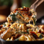 This Creamy Tuscan Chicken is a rich, one-pan dinner made with juicy seared chicken, sun-dried tomatoes, spinach, garlic, and parmesan in a luscious cream sauce. Inspired by classic Tuscan chicken recipes, it’s easy to make, packed with flavor, and perfect for busy weeknights or cozy family dinners. Serve it on its own or over pasta for a comforting meal. Discover the full recipe.