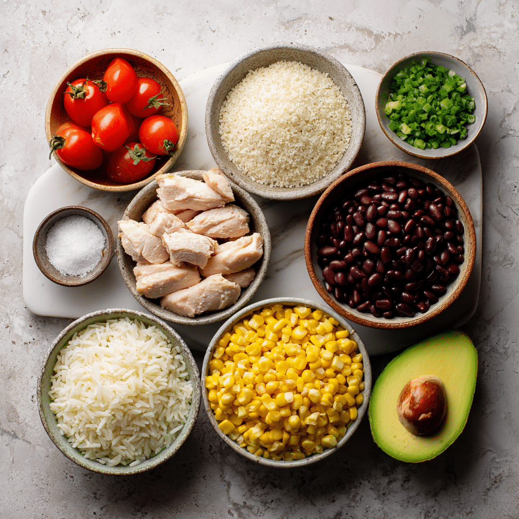 8. Assemble bowls with rice, chicken, beans, corn, cheese, tomatoes, avocado, and onion.