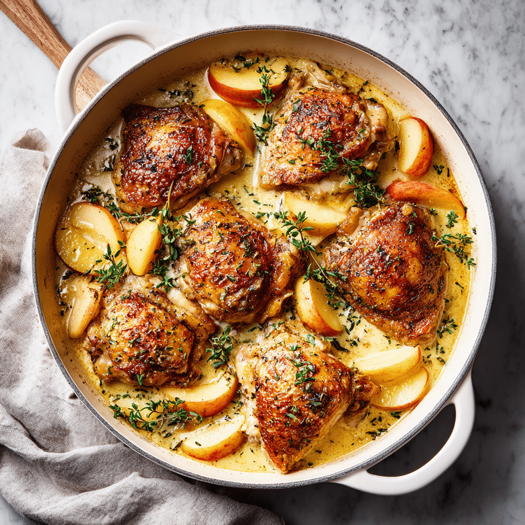 French Apple Cider Chicken, also known as Chicken Normandy, features golden crispy chicken thighs simmered in a creamy apple cider sauce with onions, Dijon mustard, thyme, and tender apples. A cozy, elegant French-inspired dinner perfect for fall and winter evenings.