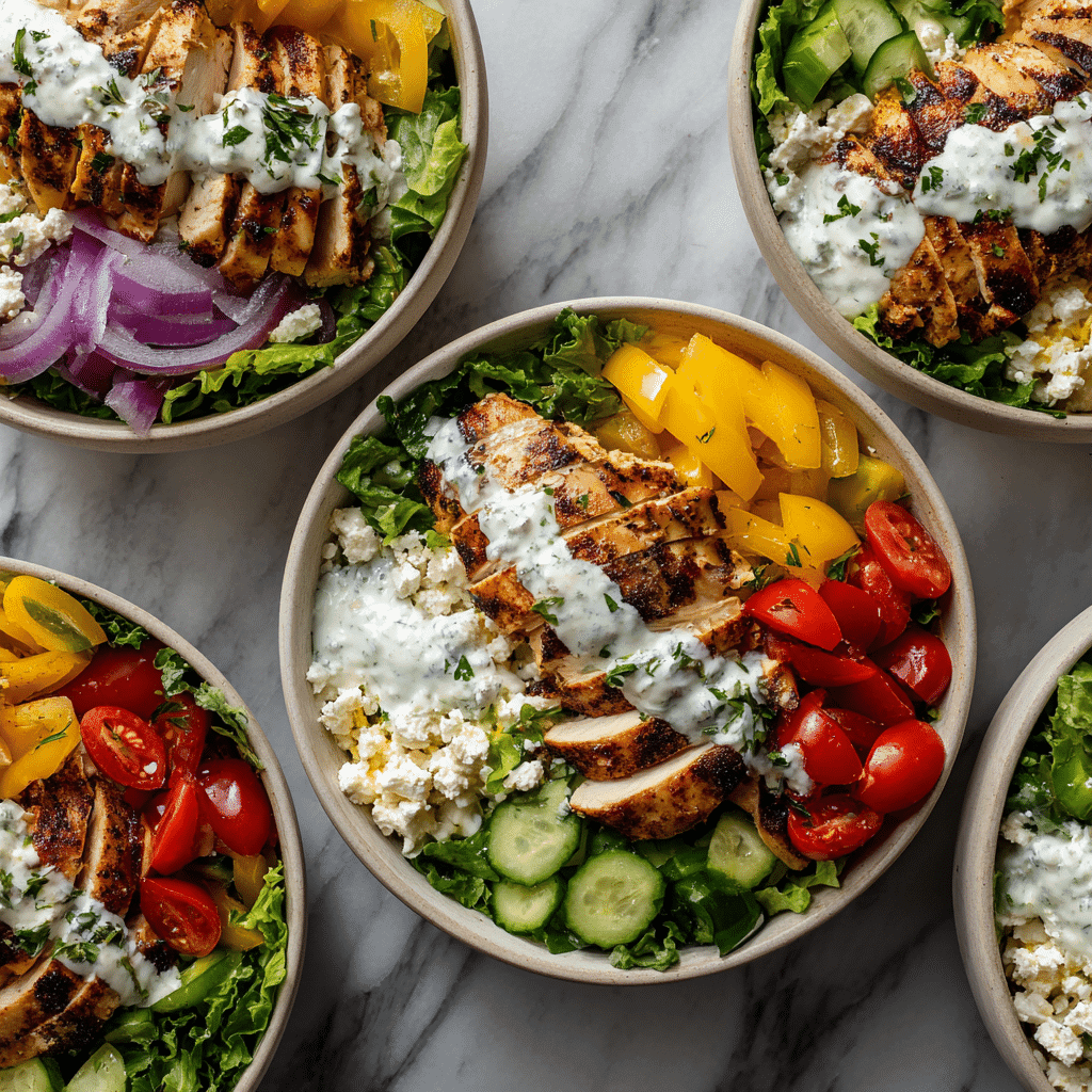Fresh and healthy Greek chicken bowls made with lemon-marinated chicken, rice or quinoa, crisp vegetables, feta, and homemade tzatziki. Perfect for meal prep or easy dinners.