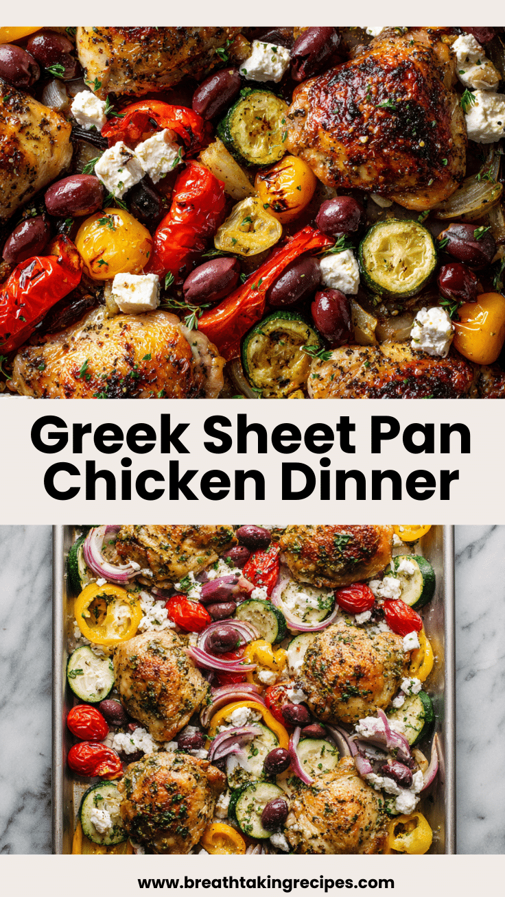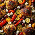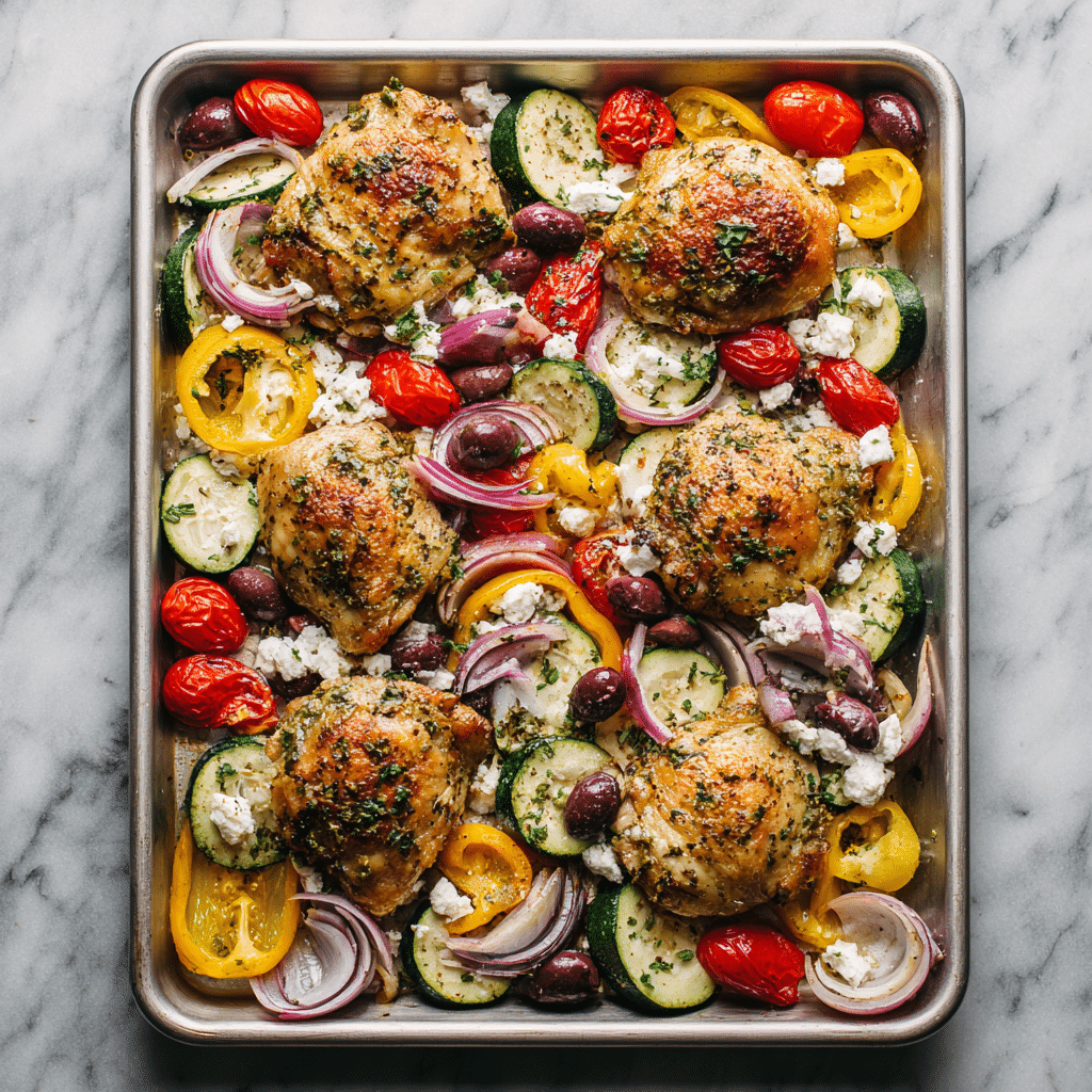 Greek Sheet Pan Chicken Dinner is a simple, healthy meal inspired by classic Mediterranean flavors. Juicy chicken thighs are marinated in olive oil, lemon, garlic, and herbs, then roasted alongside colorful vegetables, briny olives, and creamy feta cheese. Everything cooks together on one sheet pan, making this recipe perfect for easy dinners, meal prep, and anyone following a Mediterranean-style eating plan. With minimal prep and bold flavor, this Greek sheet pan chicken is a reliable go-to for busy nights.