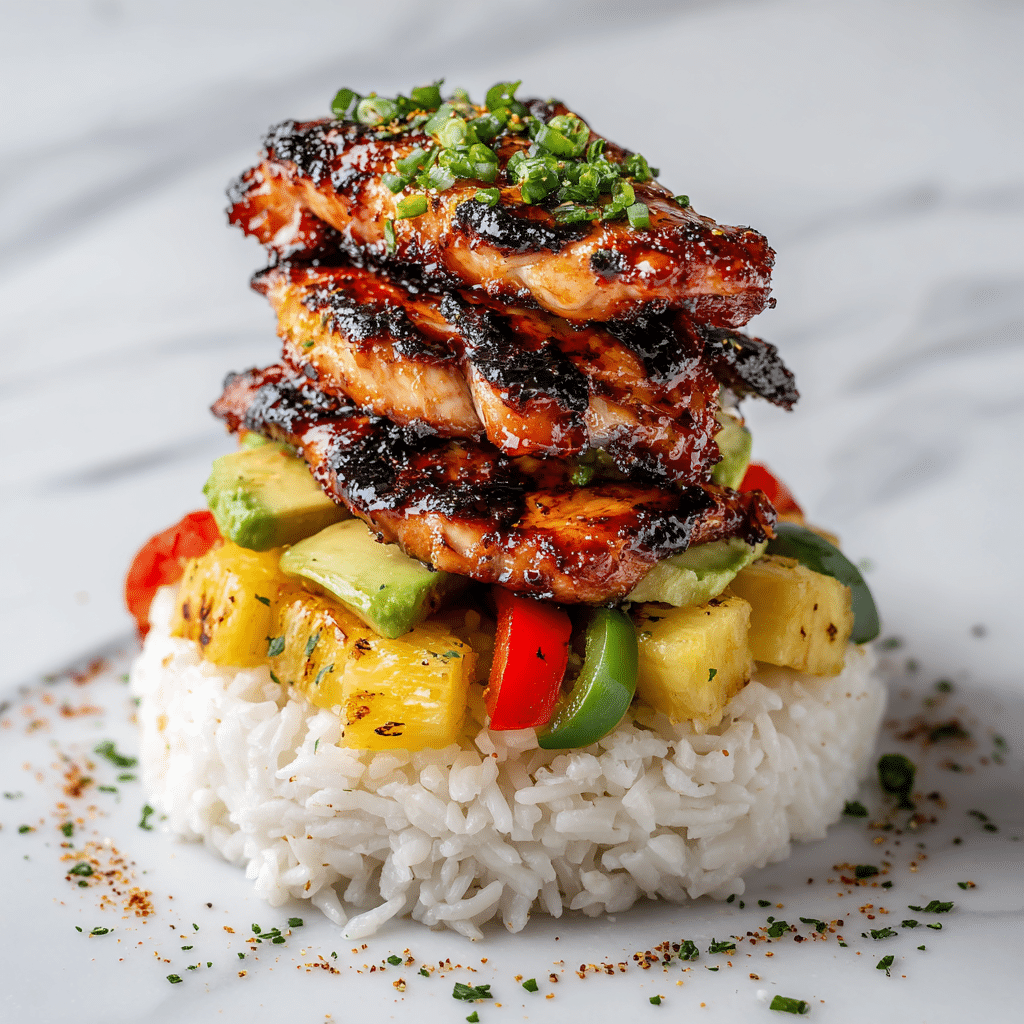 Hawaiian Huli Huli Chicken Stack is a tropical-inspired dish featuring juicy grilled chicken marinated in a sweet and savory pineapple soy glaze, served over jasmine rice and topped with fresh pineapple, avocado, and vibrant vegetables.