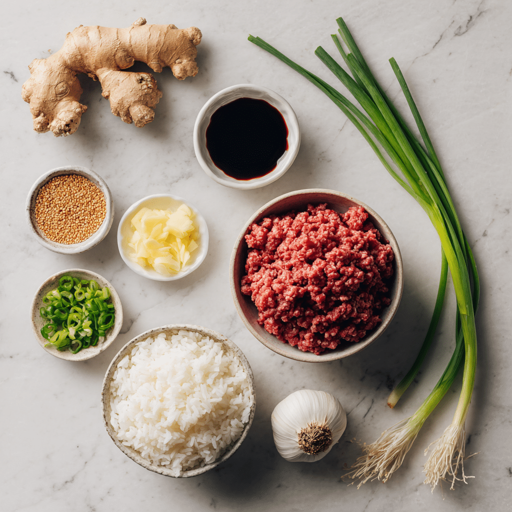 Heat a large skillet over medium-high heat and add the ground beef. Break it apart with a spatula and cook for 5–7 minutes until no longer pink. Drain excess fat if needed. Add garlic and ginger and cook for 1–2 minutes until fragrant. Stir in soy sauce, sesame oil, and green onions. Season with salt and pepper. Simmer for a couple of minutes so the flavors combine.