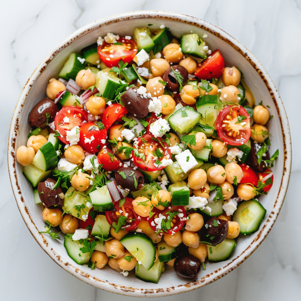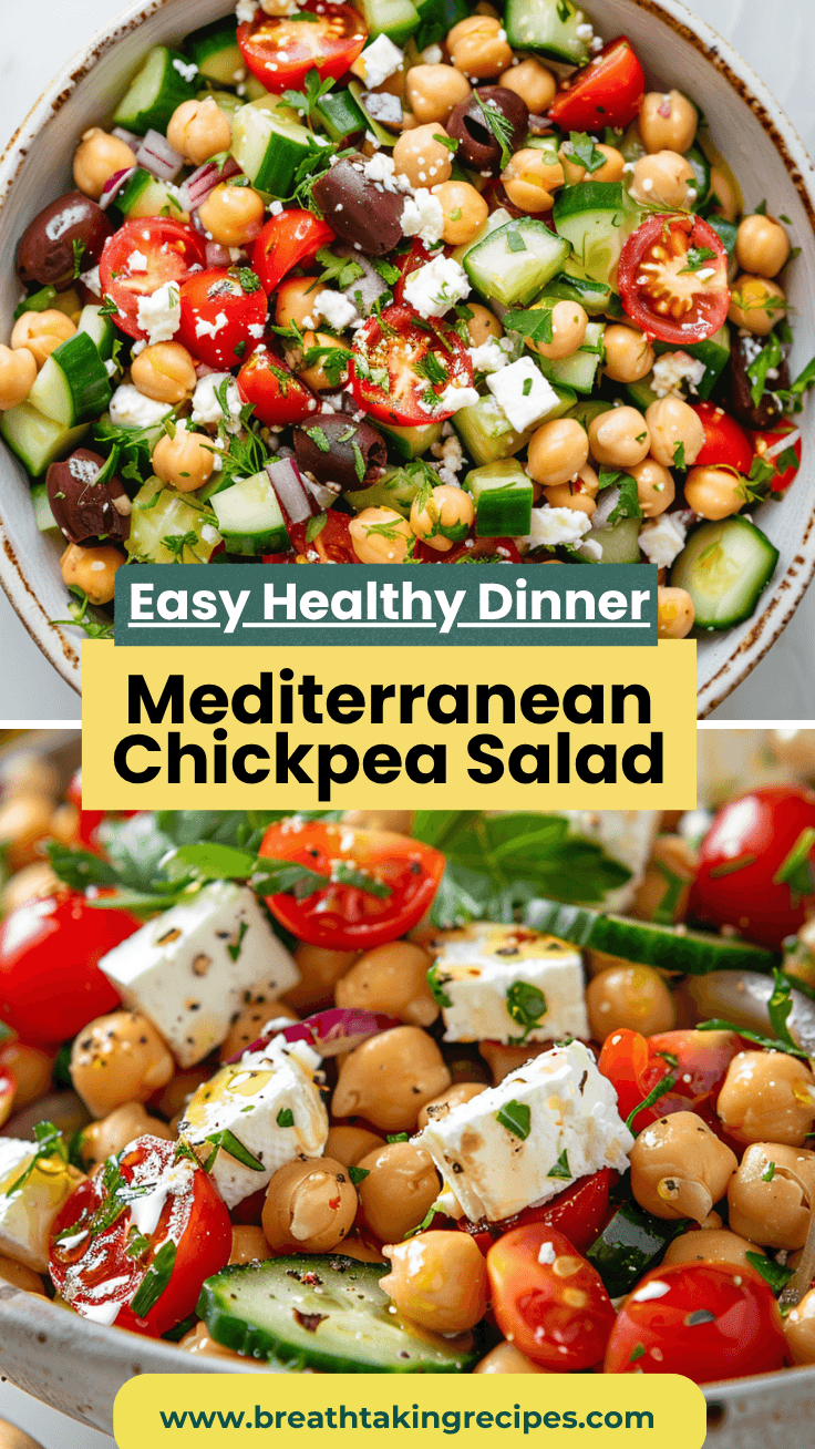 This Mediterranean Chickpea Salad is a fresh, healthy, and protein-rich dish made with chickpeas, crisp vegetables, feta cheese, and a zesty homemade dressing. Perfect for a quick lunch, light dinner, or meal prep, this Greek-inspired salad is full of vibrant flavors and textures.