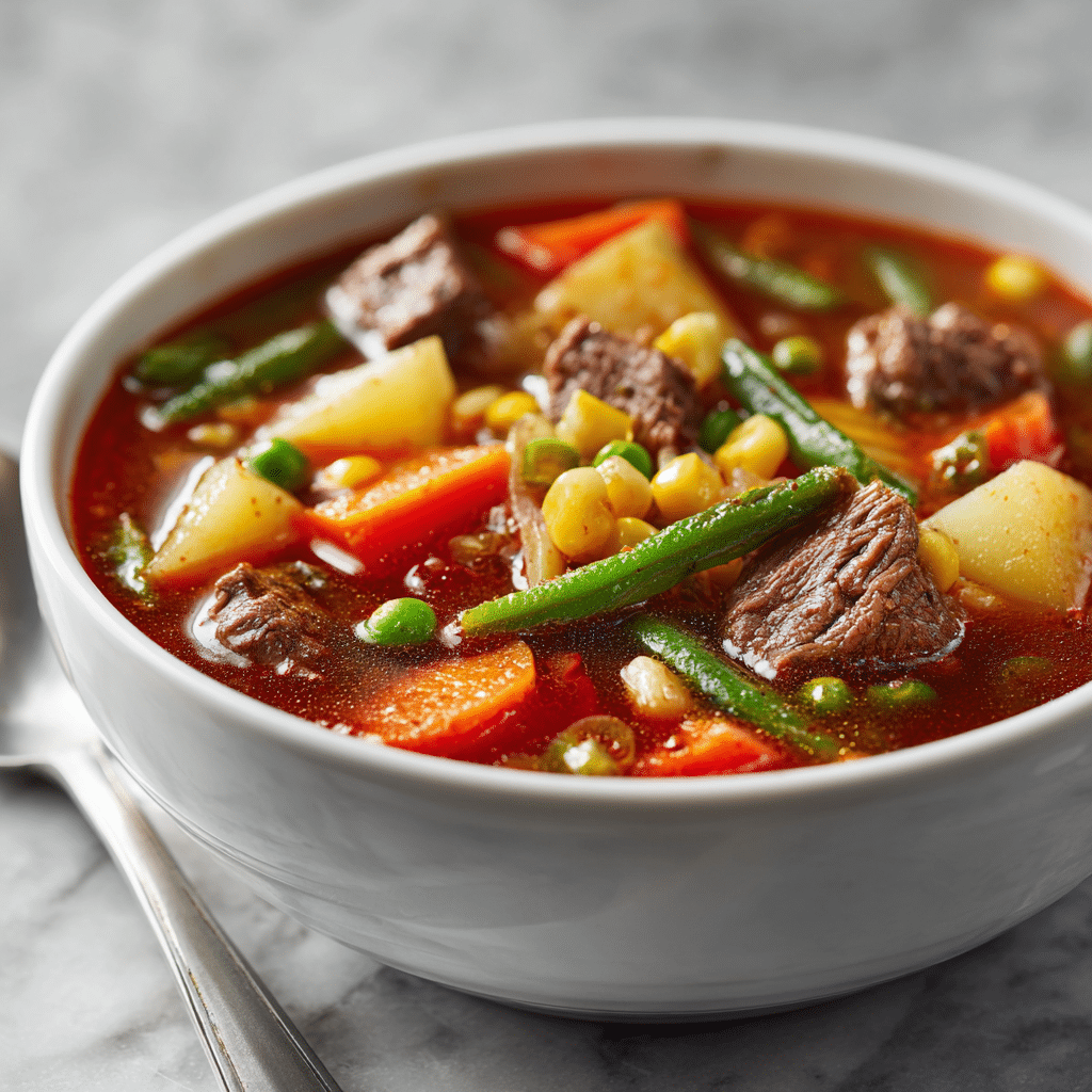 Old-fashioned vegetable beef soup with tender shredded beef, potatoes, carrots, and mixed vegetables.
