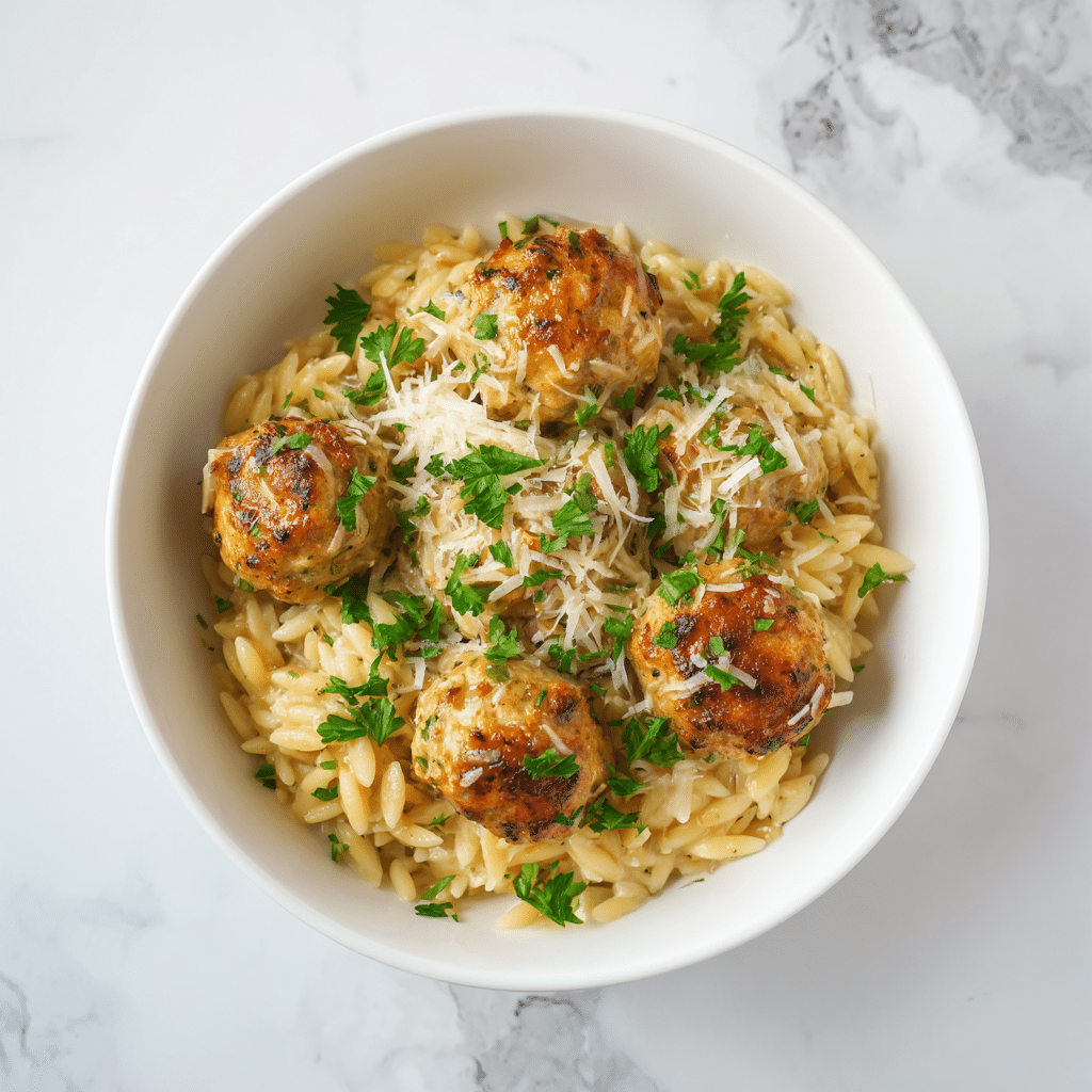 One Pan Chicken Meatballs with Orzo – Creamy Garlic Parmesan Orzo