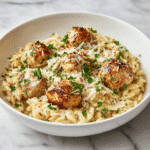 One Pan Chicken Meatballs with Orzo is a comforting and flavorful dinner that combines tender chicken meatballs with creamy garlic Parmesan orzo pasta. This dish is cooked entirely in one pan, making it a perfect option for busy weeknights when you want something delicious without creating a lot of dishes. The juicy chicken meatballs are seasoned with garlic, herbs, and Parmesan cheese, then simmered in a rich creamy sauce with tender orzo pasta. As the orzo cooks, it absorbs the savory chicken broth and cream, creating a creamy texture that pairs beautifully with the meatballs. This One Pan Chicken Meatballs with Orzo recipe delivers a balanced meal with protein, pasta, and flavor in every bite.
