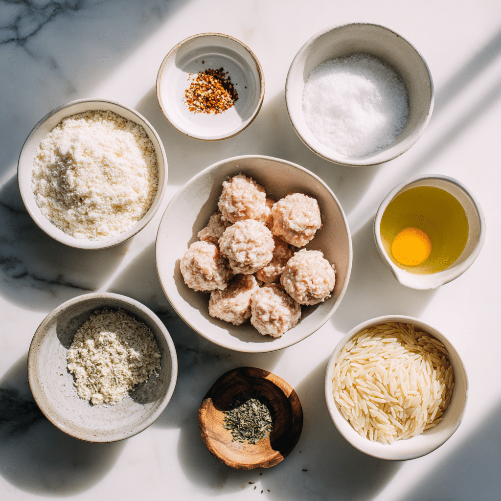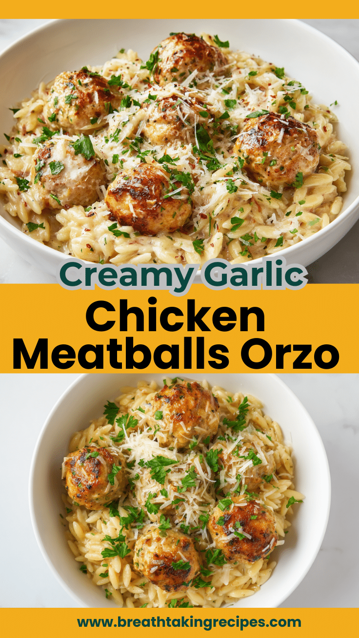 This recipe includes two main components: homemade chicken meatballs and creamy garlic Parmesan orzo.
