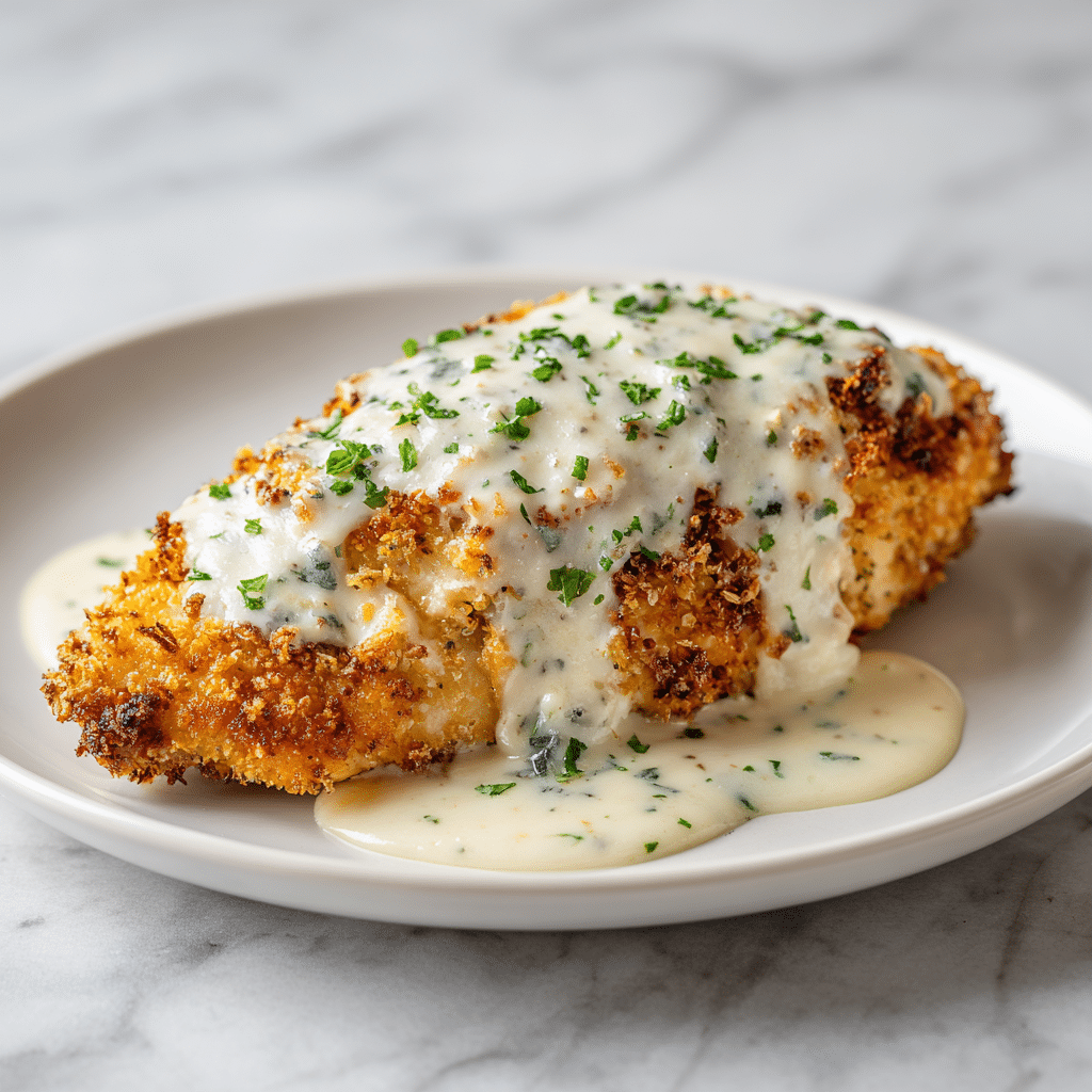 This recipe works because it layers flavor and texture beautifully. The Parmesan-panko crust locks in moisture while creating a crisp exterior. The creamy garlic sauce adds richness and depth without overpowering the chicken. Cooking the chicken in stages ensures it stays juicy inside while developing a golden crust.