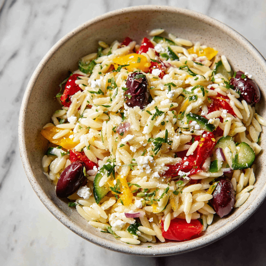 Perfect Orzo Pasta Salad With Feta And Sun-Dried Tomatoes is a vibrant, crowd-pleasing side dish filled with Mediterranean flavors. Fresh herbs, lemon zest, briny olives, and creamy feta make this cold orzo salad a standout for summer entertaining and easy meal prep.