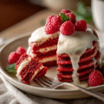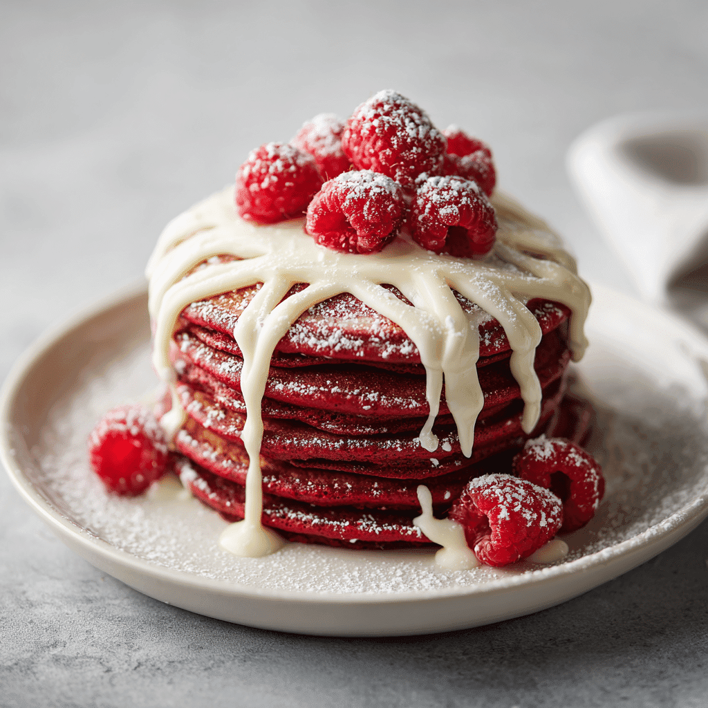 Fluffy red velvet pancakes with a subtle cocoa flavor, topped with a smooth cream cheese glaze. Perfect for Valentine’s Day or festive breakfasts.