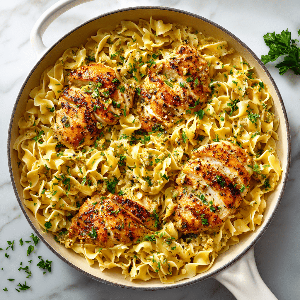 Use a large enough skillet so the noodles have room to cook evenly. If the liquid reduces too quickly before the noodles soften, add a small splash of extra broth. For faster cooking, slice the chicken breasts into cutlets or chunks. If you want a creamier finish, stir in a spoonful of cream cheese or a splash of heavy cream at the end. Fresh parsley adds color and brightness, but dried parsley works in a pinch.