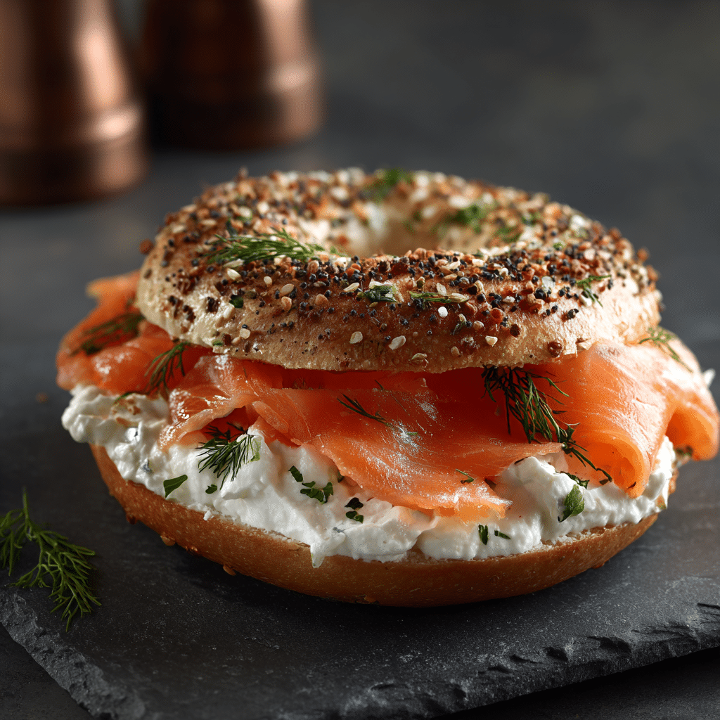 Classic smoked salmon bagel with cream cheese, capers, red onion, and fresh dill.