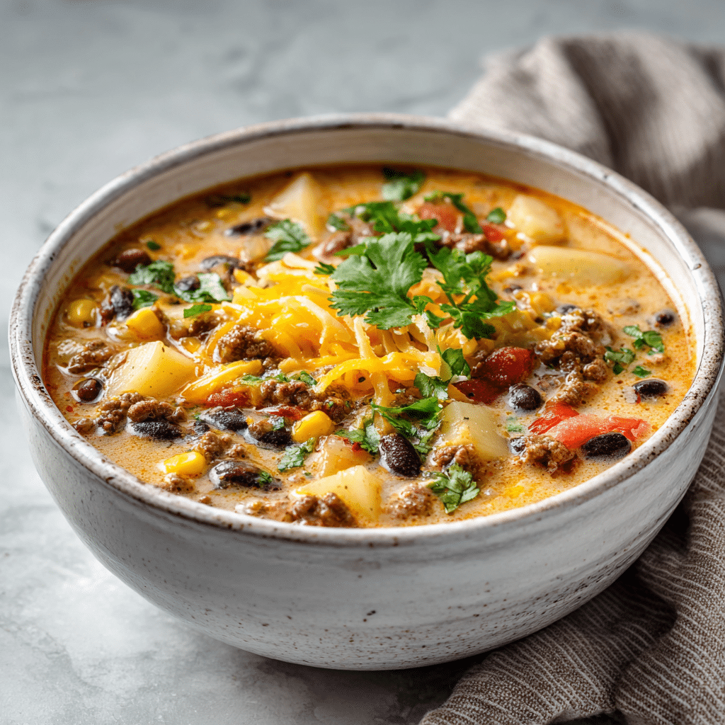 Smoky Cowboy Soup is a hearty, creamy comfort soup made with ground beef, potatoes, beans, corn, smoky spices, and melted cheese. A perfect cold-weather dinner.