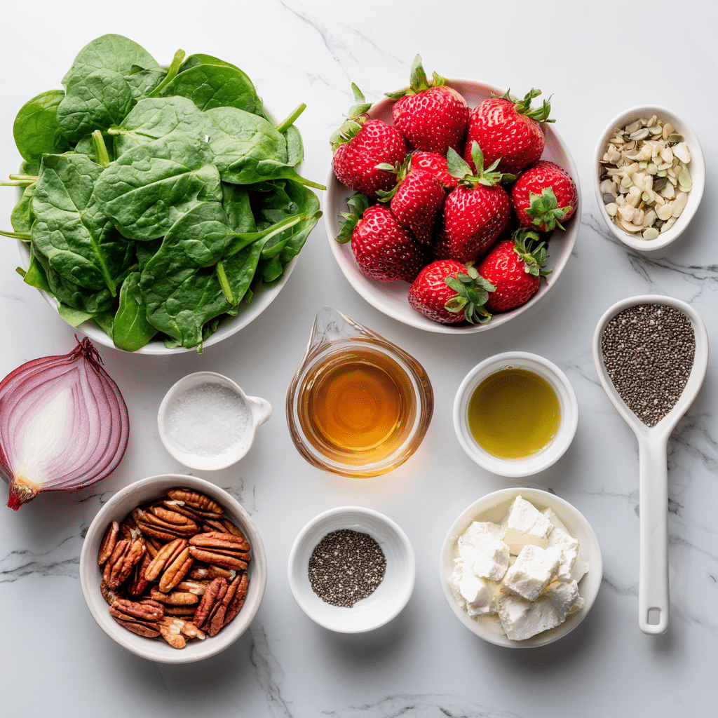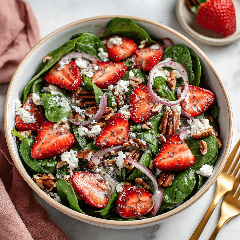Baby spinach provides a tender, mild base that pairs perfectly with sweet fruit. Strawberries add freshness, vibrant color, and natural sweetness. Pecans bring crunch and richness, especially after toasting. Red onion adds sharpness and contrast, while feta cheese contributes a creamy, salty element that balances the sweetness of the berries. The balsamic poppyseed dressing pulls everything together with a sweet and tangy finish that coats the greens without overpowering them.