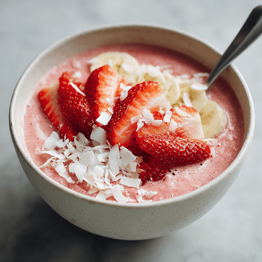 A thick and creamy strawberry banana smoothie bowl made with frozen fruit and beetroot powder. Naturally sweet, vibrant, and easy to customize with toppings.