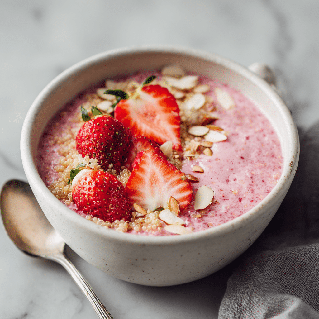This strawberry quinoa breakfast bowl is a refreshing and nourishing alternative to traditional cereal. Made with protein-rich quinoa, creamy homemade strawberry milk, and fresh fruit toppings, this bowl delivers balanced nutrition with naturally sweet flavors. It is vegan, gluten-free, and perfect for warm mornings when you want something light yet satisfying.
