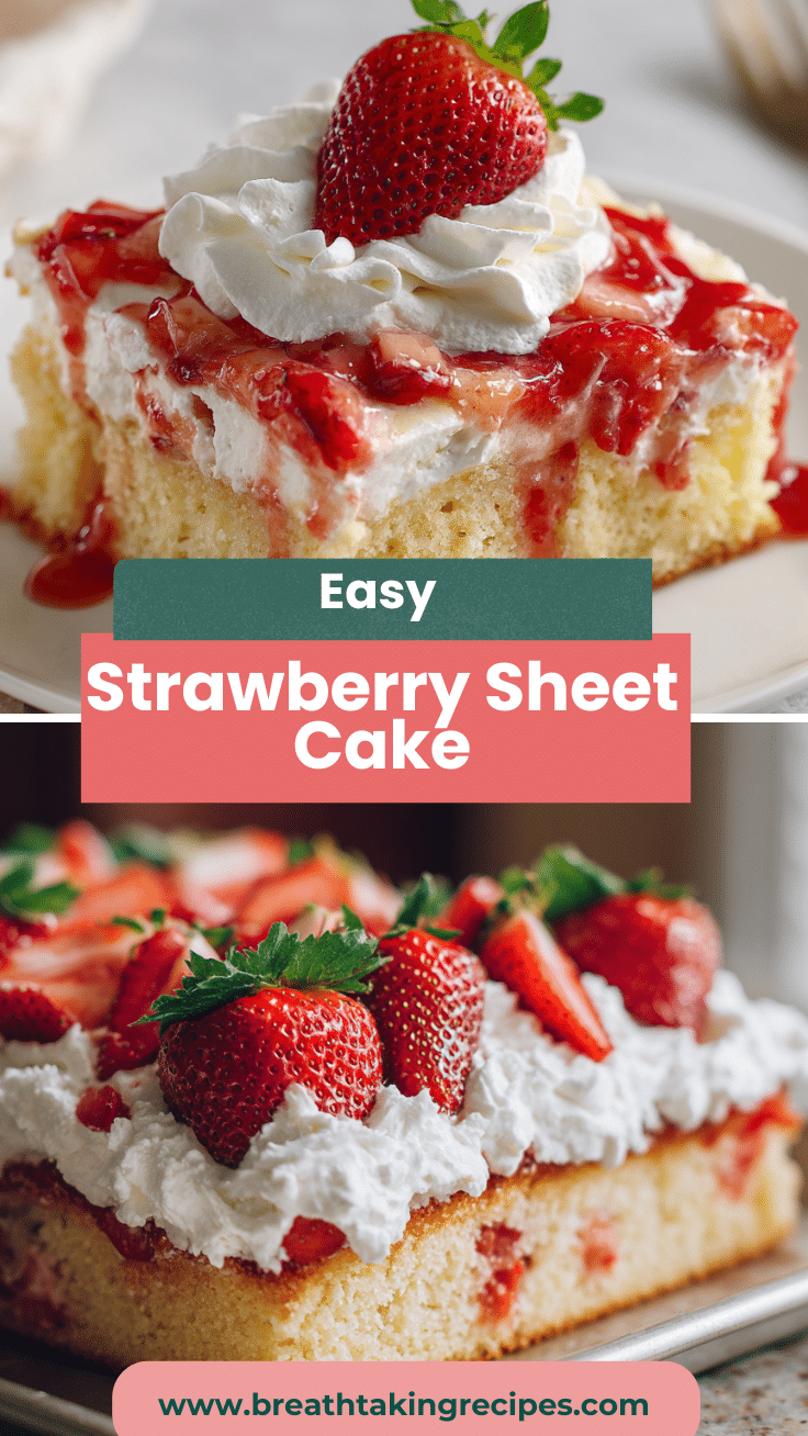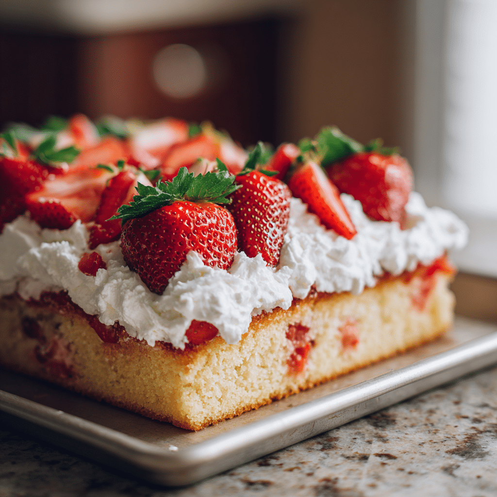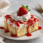 Strawberry Shortcake Sheet Cake is a simple yet beautiful dessert that captures the flavor of classic strawberry shortcake in an easy to serve cake format. The combination of soft vanilla cake, creamy whipped frosting, and sweet strawberries makes it the perfect summer dessert. Because it is easy to prepare and serves many people, this recipe is ideal for parties, family gatherings, and celebrations.