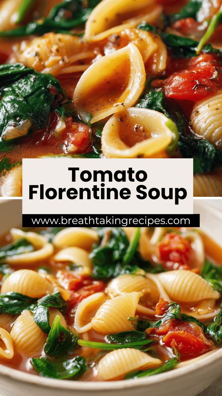 Tomato Florentine Soup made with pasta, spinach, and a rich tomato broth. Cozy, flavorful, and easy to make.