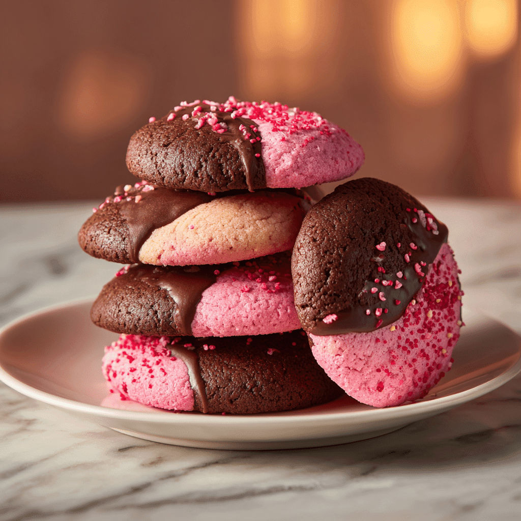 These cookies are made using two doughs a chocolate cookie dough and a pink cookie dough paired with a smooth ganache filling. Optional toppings allow you to customize the look for Valentine’s Day, Christmas, or seasonal celebrations.